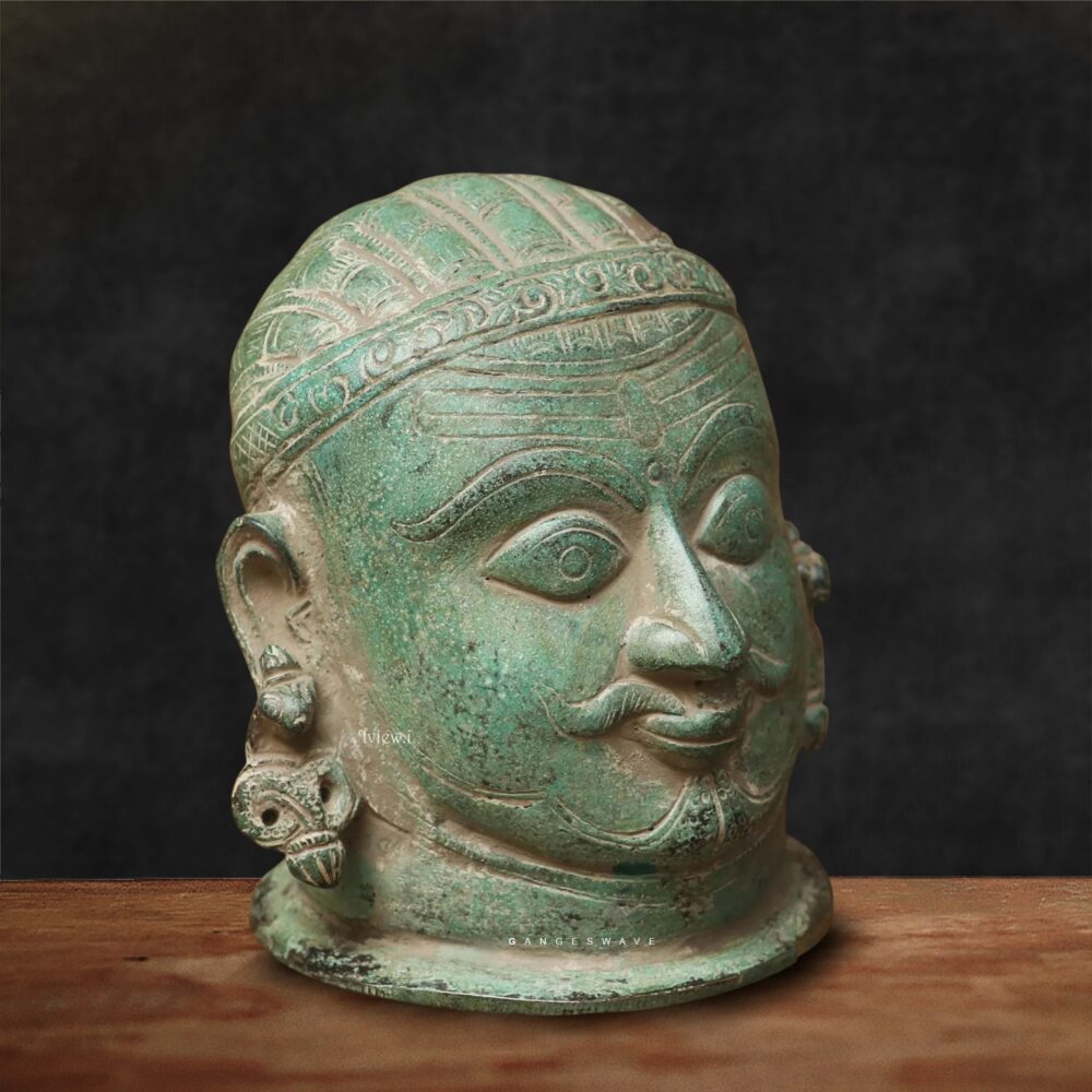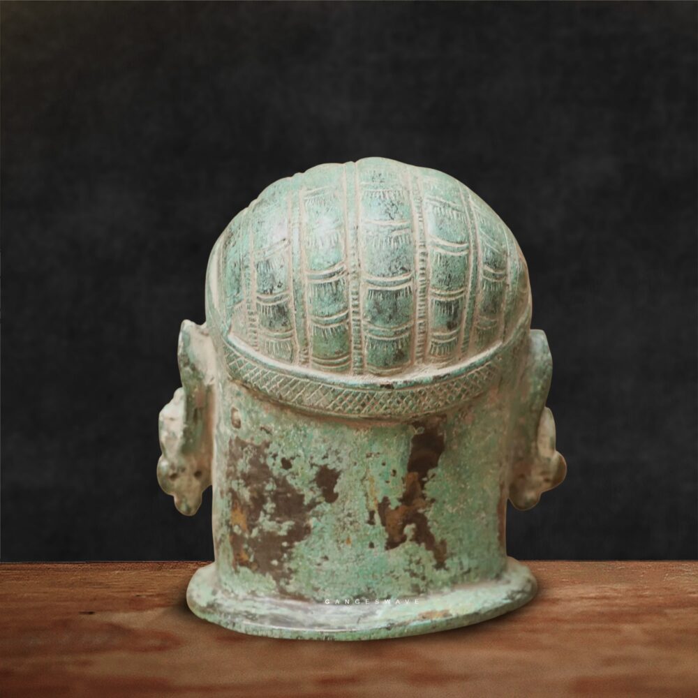 This is a stunning Khandoba mukhalinga, also known as brass lost-wax cast mukhalinga, from Maharashtra. The face would have been placed over the linga and allowed worshippers to see and be seen by Shiva. Khandoba’s exquisitely sculpted face is covered in an unique cap or turban with exquisitely detailed floral adornments.