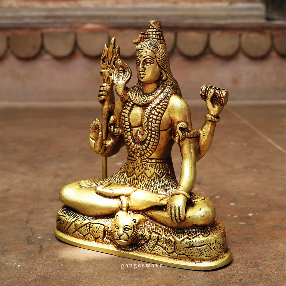 Standing Shiva brass statue sitting on tiger shin symbolize its super power and authority yet expressing his diving blessing. A statue made in brass using lost-wax method.