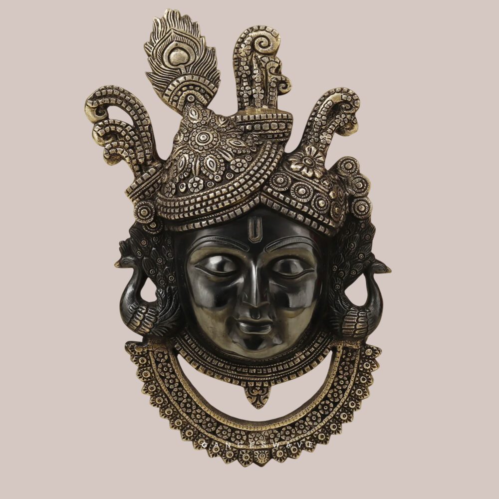 Meticulously sculpted by skilled Indian artisans, this exquisite piece showcases Srinathji—a divine form of Lord Krishna—crafted in pure brass with a striking contrast of matte black and antique gold finishes. Every intricate detail, from the ornate crown to the beaded necklace, reflects timeless craftsmanship and spiritual grace.