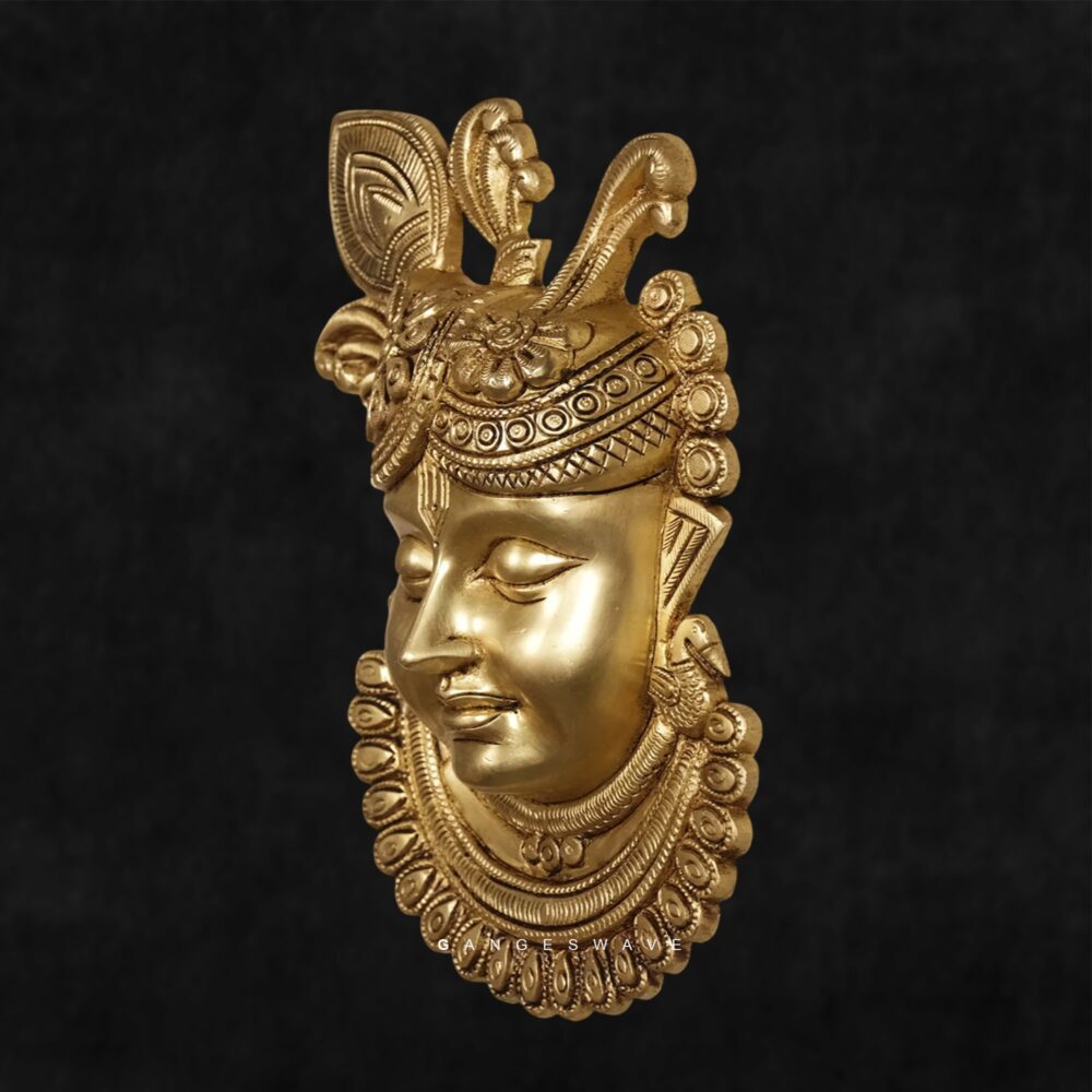 Meticulously sculpted by skilled Indian artisans, this exquisite piece showcases Srinathji—a divine form of Lord Krishna—crafted in pure brass with a striking contrast of matte black and antique gold finishes. Every intricate detail, from the ornate crown to the beaded necklace, reflects timeless craftsmanship and spiritual grace.
