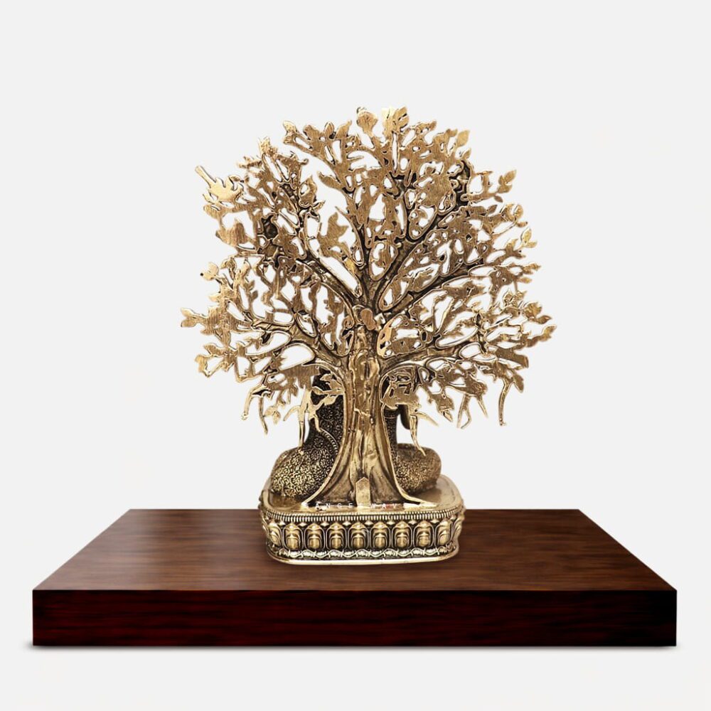 Crafted from premium superfine brass, this sculpture showcases exceptional craftsmanship with intricate carvings on the robe, serene facial expressions, and delicately sculpted leaves and birds on the Bodhi tree. The antique gold finish enhances its spiritual presence, making it an ideal luxury decor piece for homes, meditation spaces, temples, offices, and spiritual interiors..