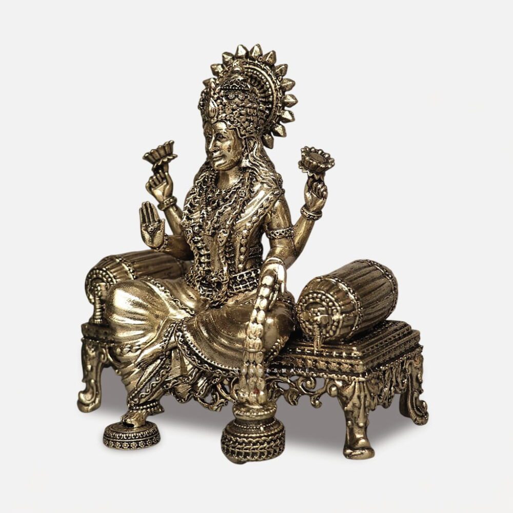 Seated in a regal posture with intricate detailing, this premium brass Lakshmi murti beautifully captures traditional Indian artistry—perfect for home temples, décor, and auspicious gifting.