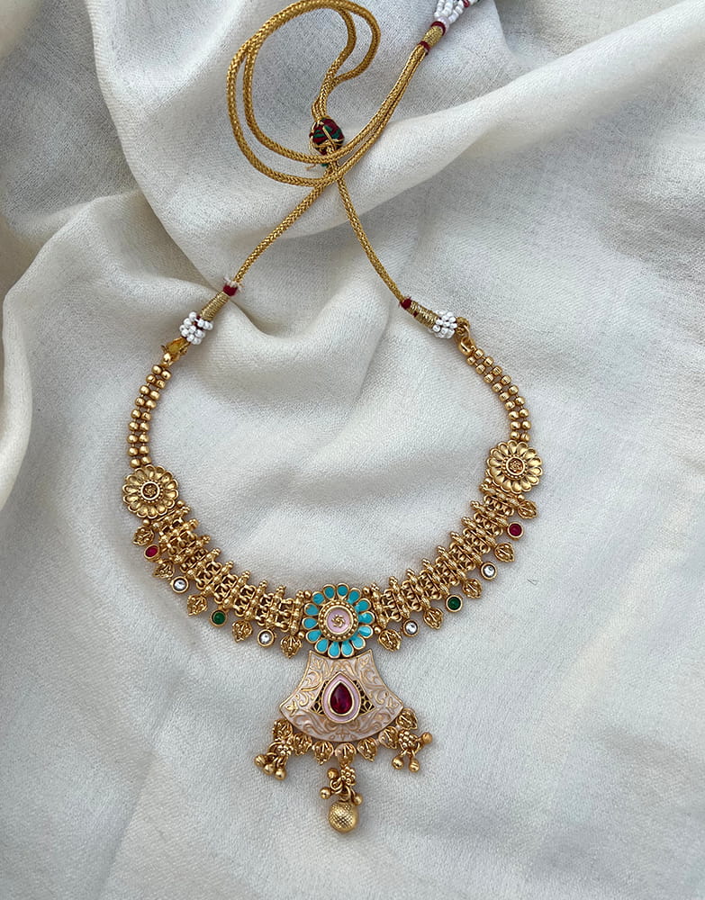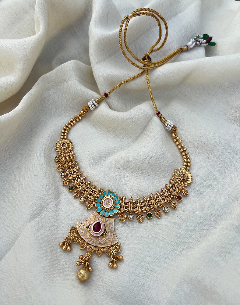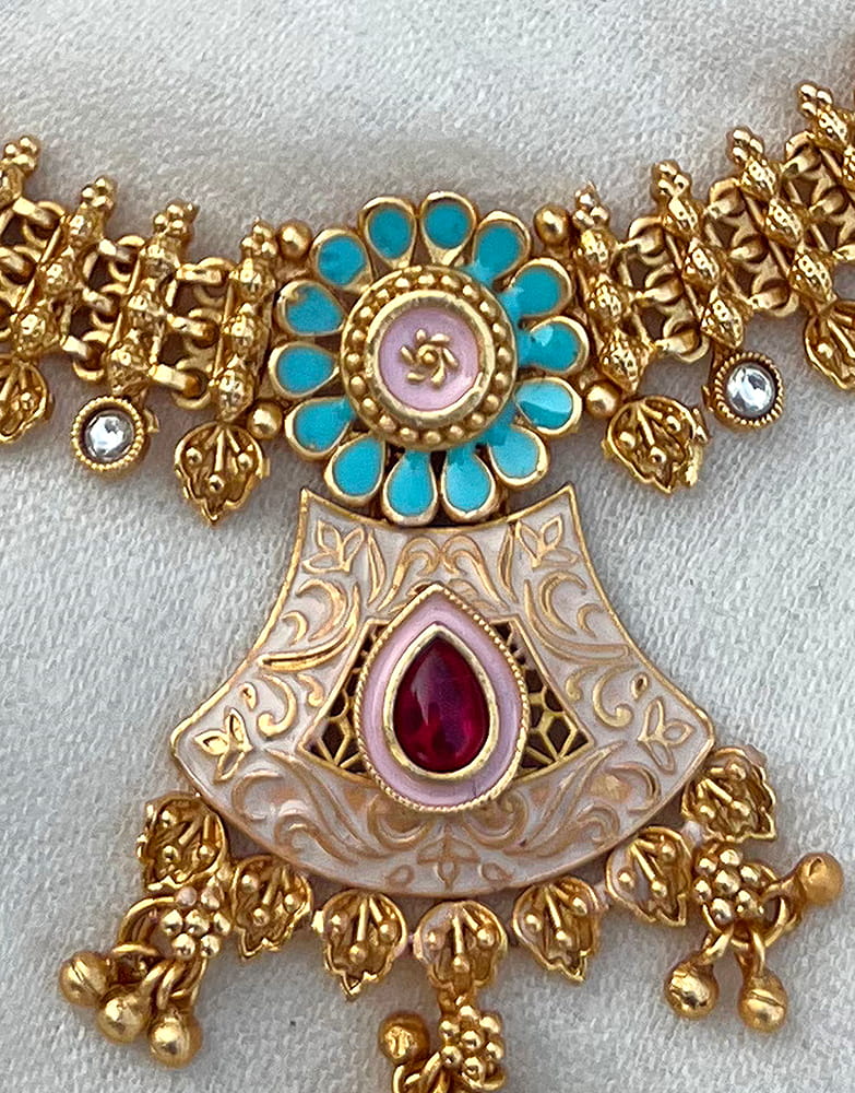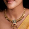 Temple-Inspired Gold-Toned Statement Necklace with Enamel & Kundan Detailing