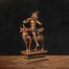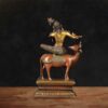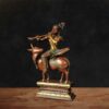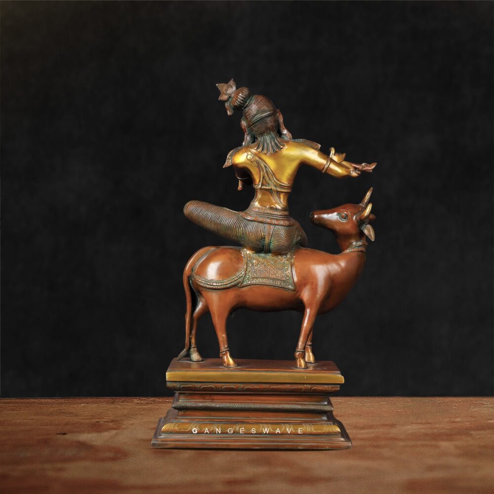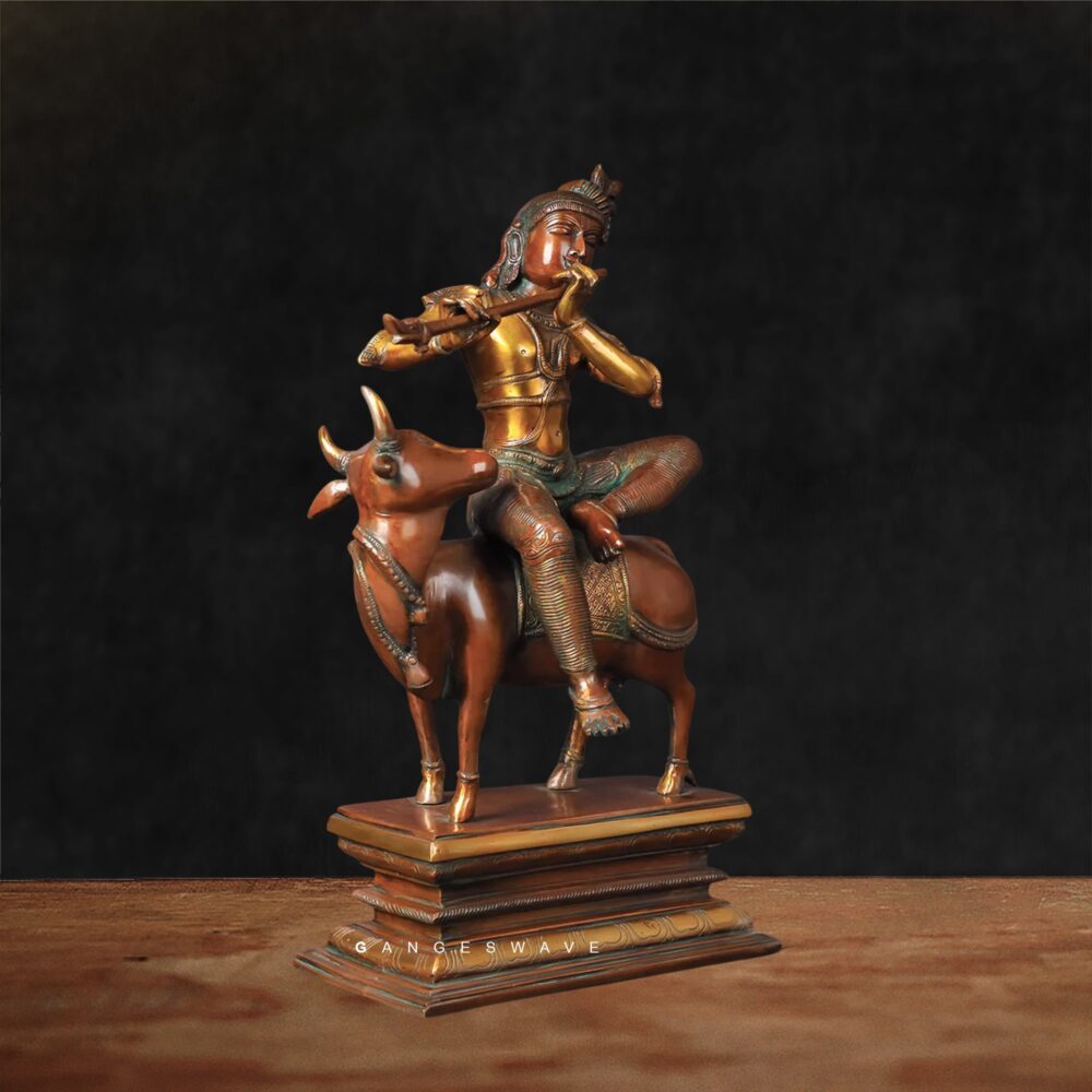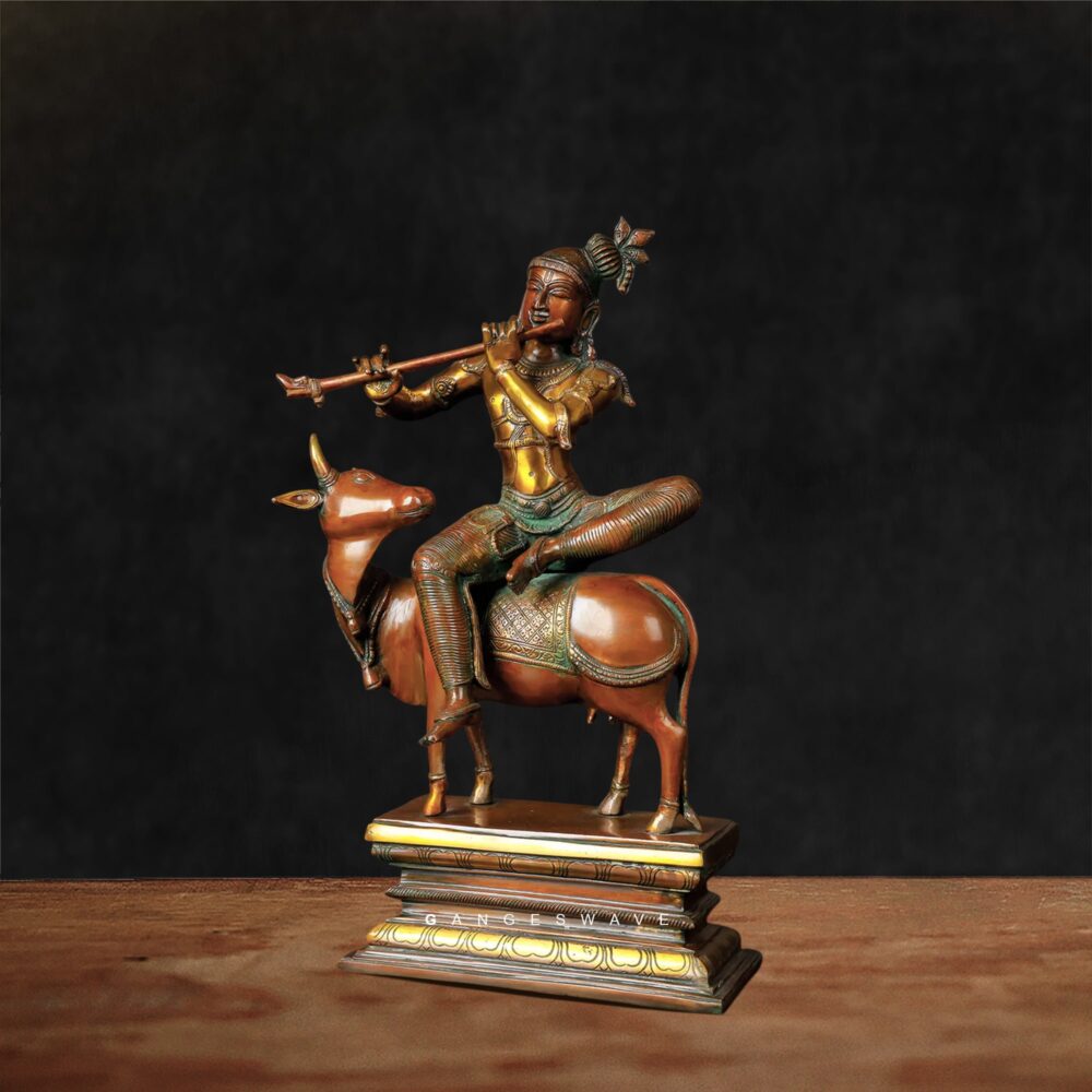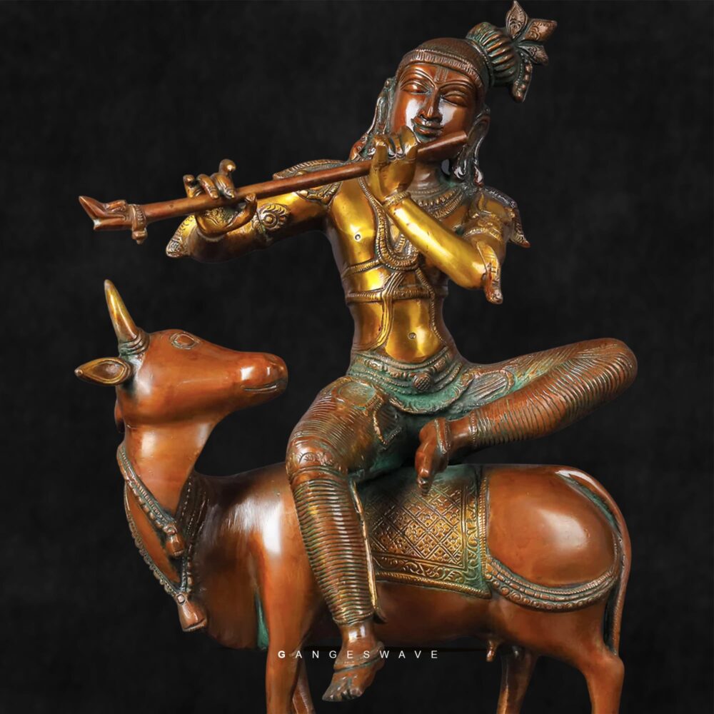 Crafted with meticulous attention to detail, this masterpiece captures the essence of Lord Krishna’s enchanting persona as he sits gracefully atop a sacred cow. Cast in lustrous brass, every curve and contour of Lord Krishna’s form is rendered with precision, from the gentle slope of his shoulders to the intricate patterns.