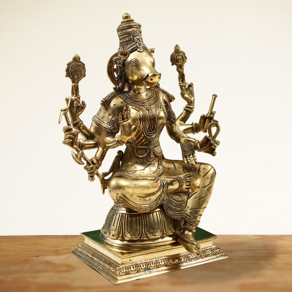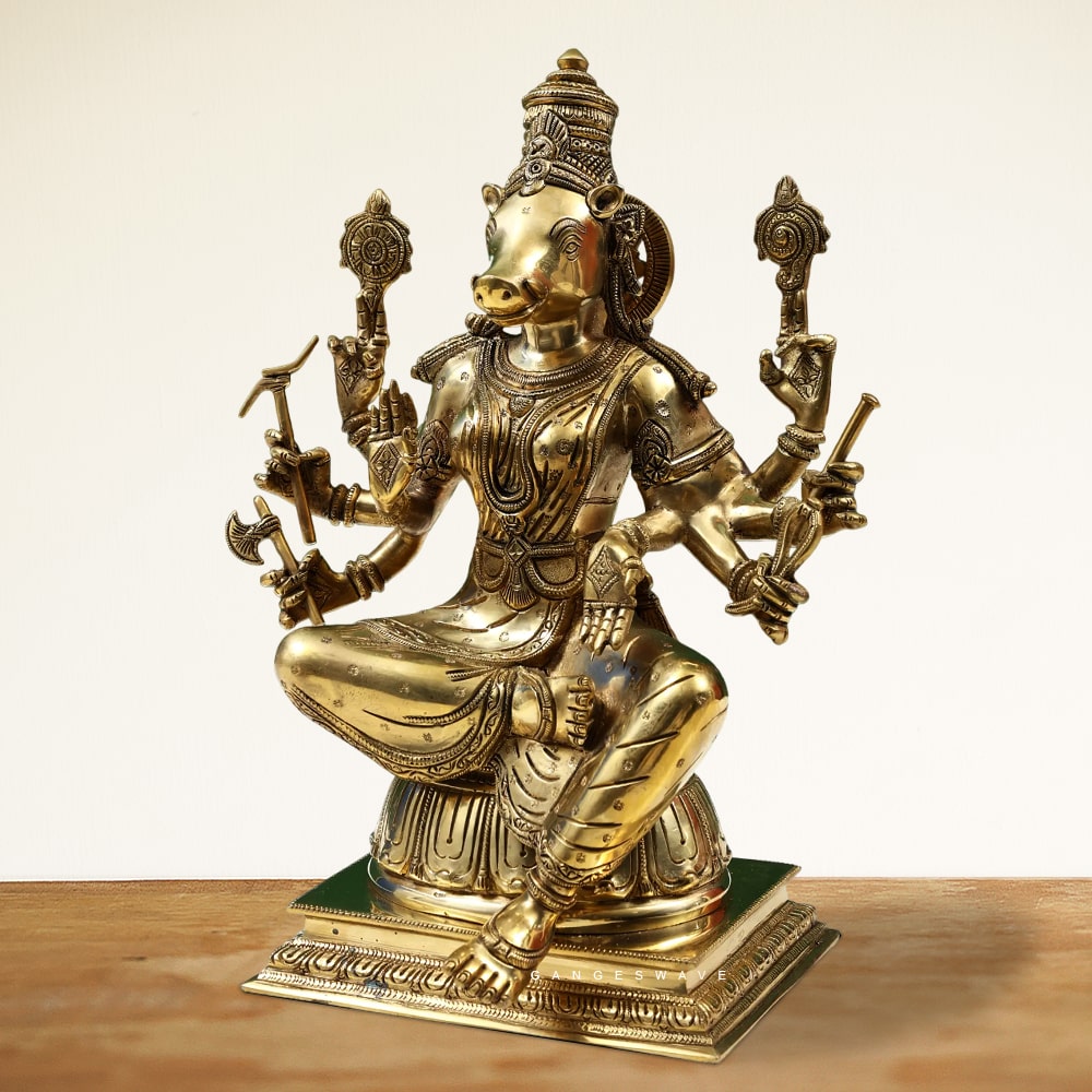 Varahi Brass Ganesh Statue, a symbol of wisdom, prosperity, and new beginnings. The artistry is in the exquisite detailing – from the serene expression on Lord Ganesha’s face to the intricate patterns adorning his crown, trunk, and attire. Every feature has been carefully crafted, reflecting the depth of traditional craftsmanship passed down through generations.