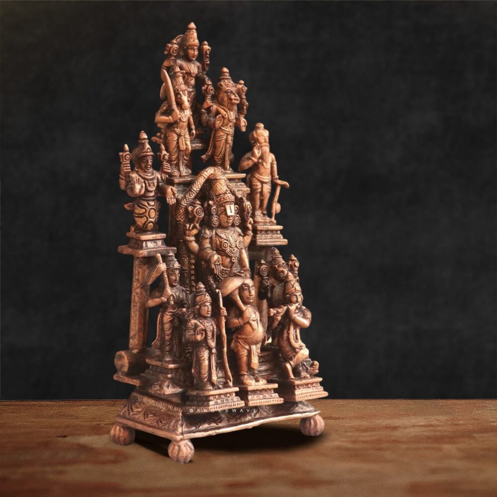 This pure copper Vishnu with Dashavatar statue, showcasing intricate craftsmanship and divine formation, perfect for adding spiritual elegance and timeless charm to any décor.