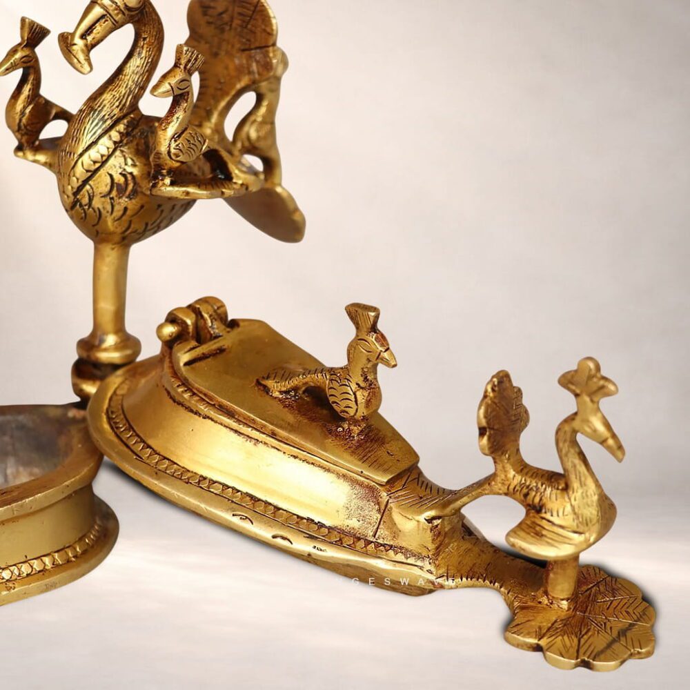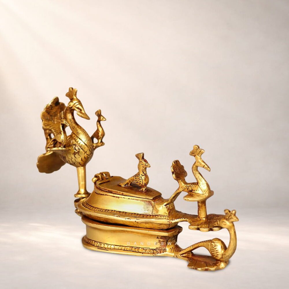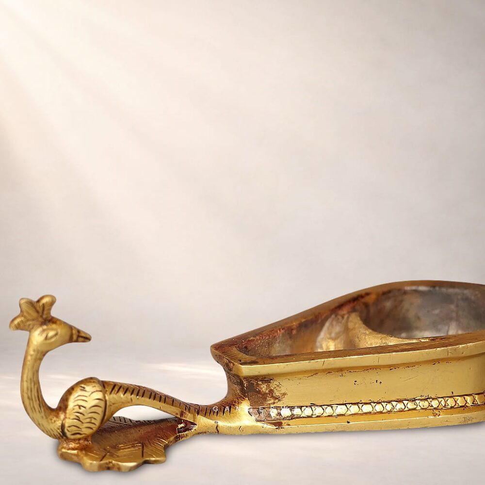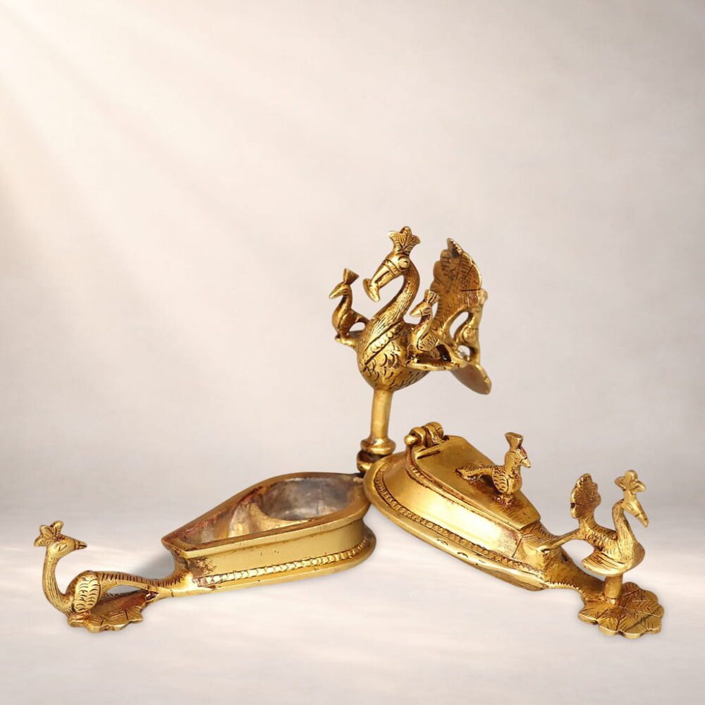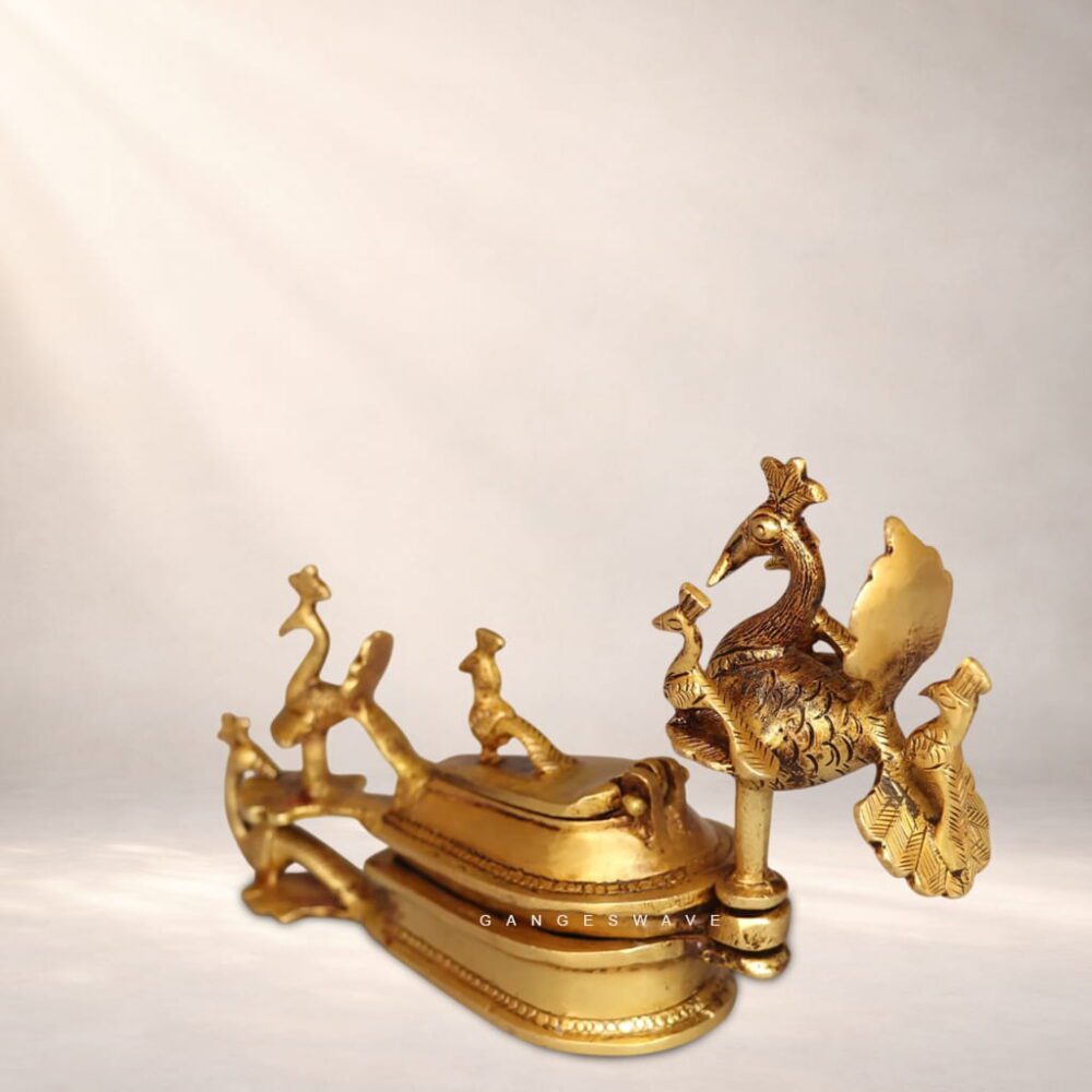 Made from solid premium brass, the holder features intricate detailing of peacocks—symbols of prosperity, beauty, and divine grace in Indian culture. The rich antique golden finish enhances its vintage appeal, making it perfect for daily rituals, festive poojas, temples, or as a meaningful return gift.