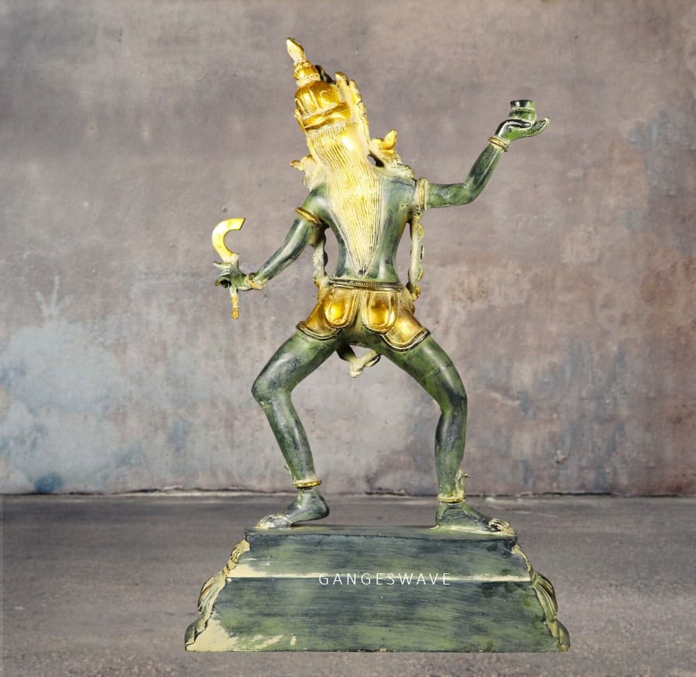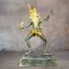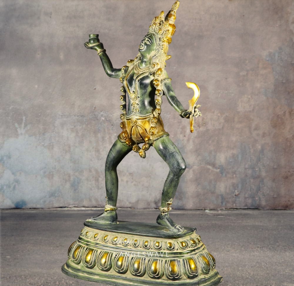 Dancing Ma Kali statue, adorned with a garland of skulls and crowned with regal elegance. Finished with a vintage look, in superfine brass, this statue exudes fierce grace and timeless power, making it a striking addition to your home or altar, and a testament to divine strength and beauty.